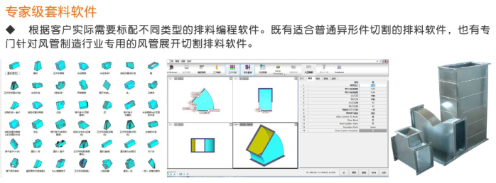 加工范圍:0.2-6.0mm任意材料鋼板的切割成型!可切割各種異形件,電腦直接畫(huà)圖,導(dǎo)出加工程序,批量高速切割,效果好,精度高,不掛渣!配合專(zhuān)用的風(fēng)管展開(kāi)軟件,自動(dòng)生成圖紙、導(dǎo)出加工程序。操作人員所需要做的就是在軟件中選擇所需要的風(fēng)管樣式,輸入所需要的尺寸,然后調(diào)出加工程序進(jìn)行切割就可以了。既方便快捷、又精確實(shí)用。